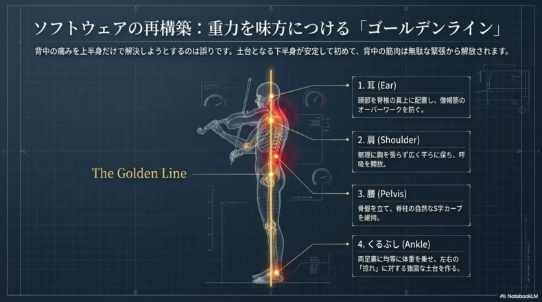 - 根本改善: 背中ではなく「体幹(腹圧)」で支える意識と、肩甲骨의 可動域を広げるリセット運動。