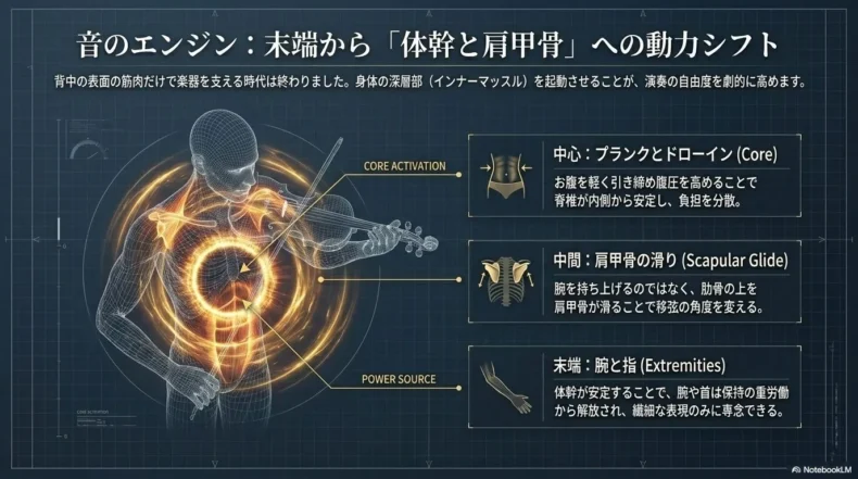 バイオリンを長時間安定して構えるためのパワーは、実は背中の表面にある筋肉だけで生み出すものではありません。お腹周りや腰椎を支える「体幹(コア)」がしっかりしていれば、背中の筋肉は「保持」という重労働から解放され、より繊細な表現やビブラートに集中できるようになります。