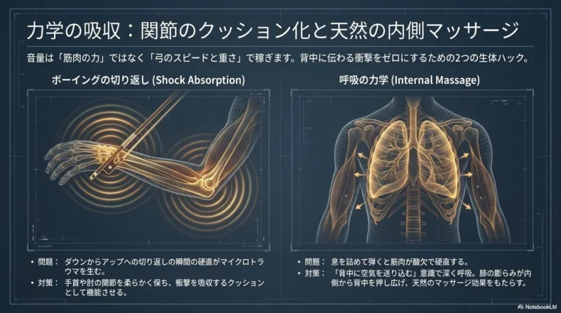 ボーイングは呼吸と密接に関係しています。息を詰めて弾くと背中の筋肉は酸素不足で硬くなりますが、フレーズに合わせて深く呼吸をすると、肺の膨らみが内側から背中の筋肉を押し広げ、天然のマッサージ効果をもたらしてくれます。