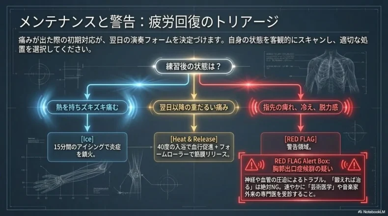 私の周りの奏者たちは、練習直後のアフターケアを欠かしません。これを怠ると、疲労が蓄積して慢性的な「しこり」になり、演奏フォームそのものを破壊してしまう恐れがあるからです。