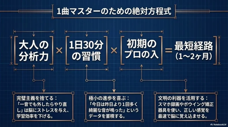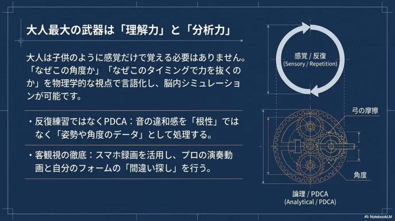しかし、音楽理論を学んできた私の視点では、大人には大人の、論理的で効率的な上達法があると考えています。