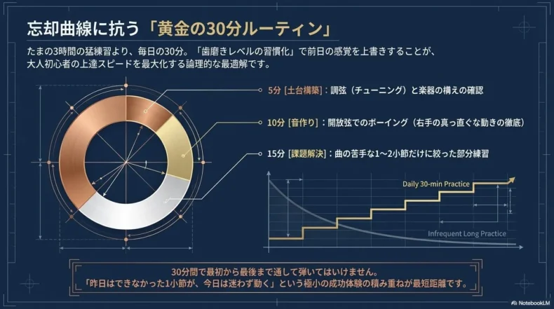 しかし、バイオリンという繊細な楽器において、「たまに3時間の猛練習」よりも「毎日30分の継続」の方が、1曲弾けるまでの期間を圧倒的に短縮します。
