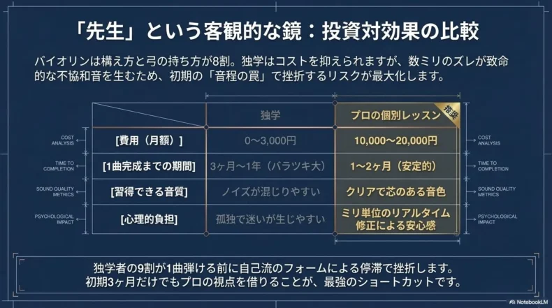 バイオリンにおいても、「プロの耳を借りる」ことは、時間を金で買うのと同義であり、結果として「1曲弾けるまで」の期間を半分以下に短縮します。