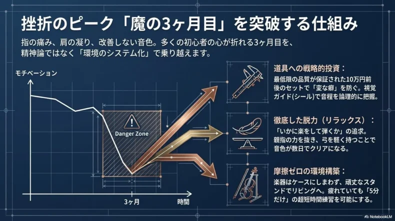 「今日は昨日より1回多く、綺麗な開放弦の音が鳴った」という極小の進歩を喜べるかどうかが、1曲完成までの期間を完走できるかどうかの分かれ目になります。