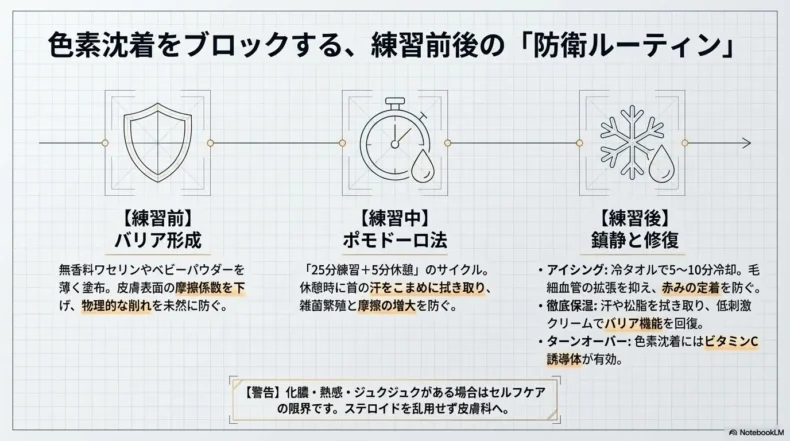 - 肌のケア:練習直後のアイシングと保湿、衛生管理が色素沈着を防ぐ鍵。