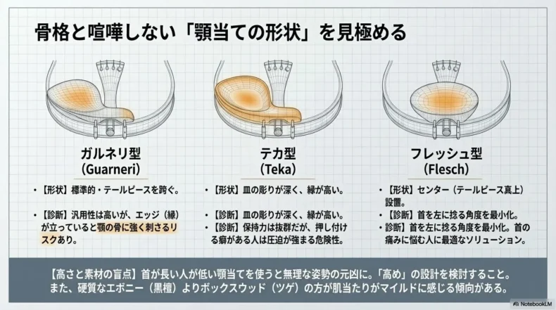 カバーを使っても根本的に痛みが引かない場合は、顎当ての「形状」そのものがあなたの骨格と喧嘩している可能性が高いです。