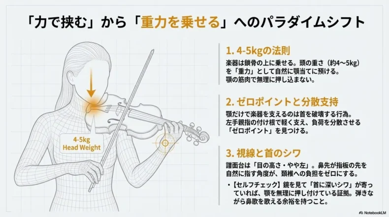 まずは楽器を鎖骨の上に安定させ、頭の重さ(約4〜5kg)を自然に顎当てに「預ける」感覚を掴んでみてください。