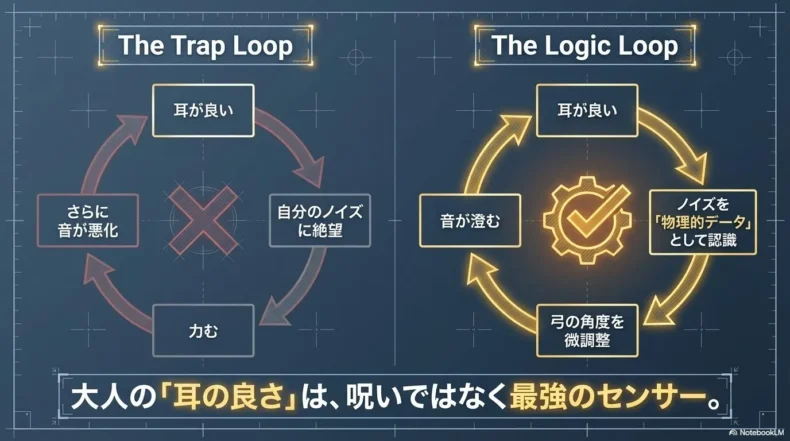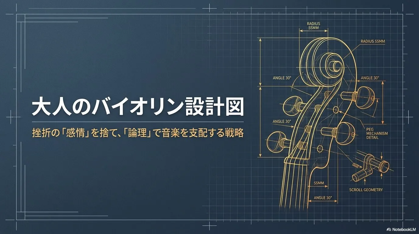 音高時代のバイオリン専攻の友人は、「初心者は自分の音を『音楽』として聴くのではなく、単なる『物理的な振動』として客観視する訓練が必要だ」と言っていました。美しくない音を「失敗」と捉えるのではなく、「弓の角度がコンマ数ミリずれているというデータ」として処理する冷静さが、大人の継続には不可欠なのです。
