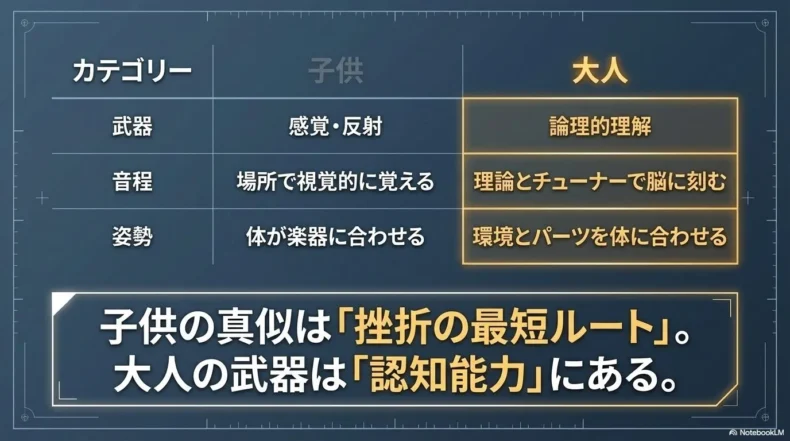感覚だけに頼る子供の練習法を真似るのではなく、「論理で耳を補佐する」アプローチを取ることが、大人がこの技術的障壁を突破する鍵になります。