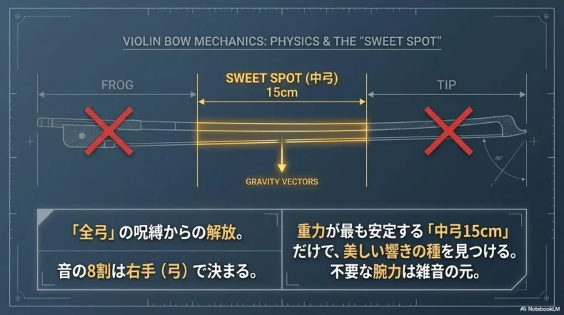 初心者は教本通りに「弓の端から端まで目一杯使って弾く(全弓)」ことに固執しがちですが、これは技術的に極めて高度な動きです。弓の元(手元)は重く、先(先端)は軽い。この重量変化を腕の重さで補正し続けるのは至難の業です。