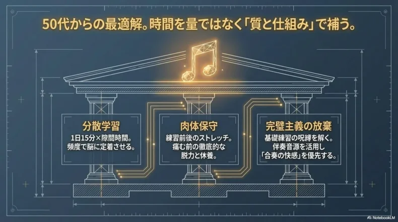 50代の方は仕事や家庭で責任ある立場にあり、まとまった練習時間を確保するのが困難です。そこで推奨したいのが、「1日15分」を生活に組み込むことです。週末に3時間まとめて練習するよりも、毎日15分、楽器を触る方が脳への定着率は圧倒的に高まります。
