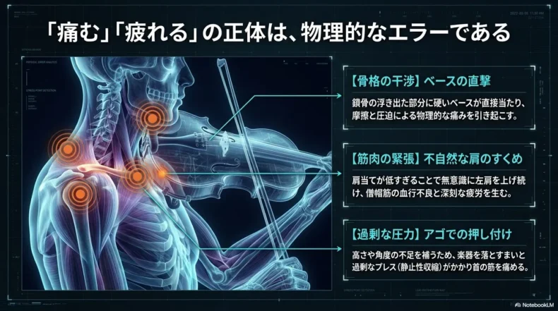 練習中に首や鎖骨に強い痛みを感じたり、本番中に楽器が落ちるような不安を覚えたりするのは、実は非常に多くの方が抱える深刻な問題です。