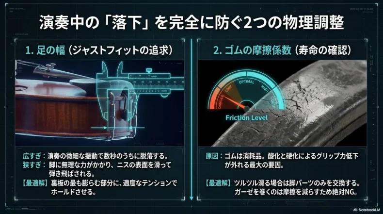 - 外れる対策: 楽器の裏板幅に合わせた正確な足の幅調整と、ゴムパーツの交換。