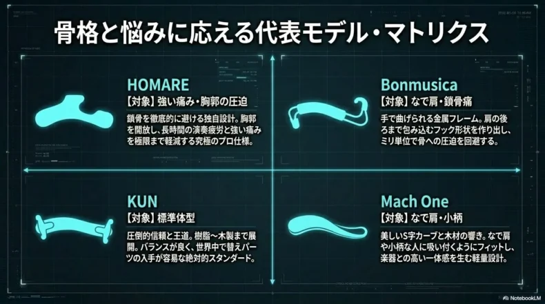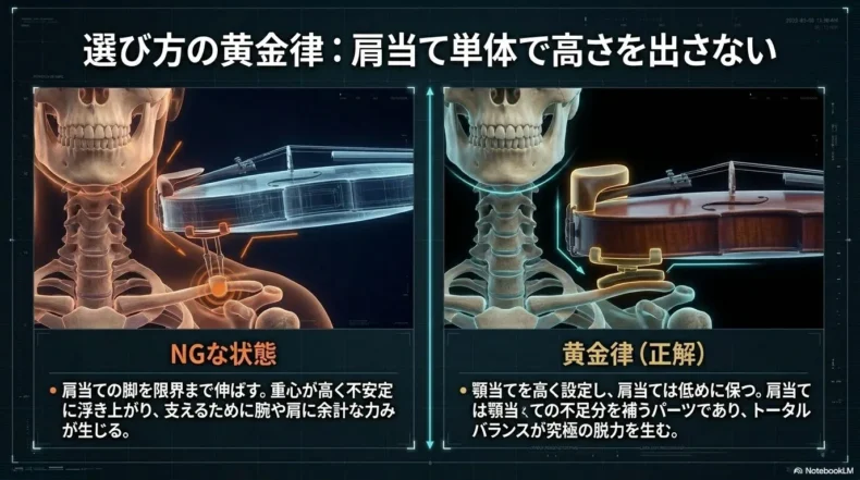 - 選び方の黄金律: 肩当てだけで高さを出さず、顎当てとのトータルバランスで選ぶ。