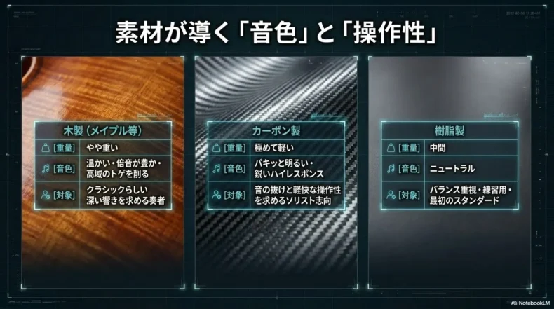- 素材の特性: 音色の温かさを求めるなら木製、レスポンス重視ならカーボンが最適。