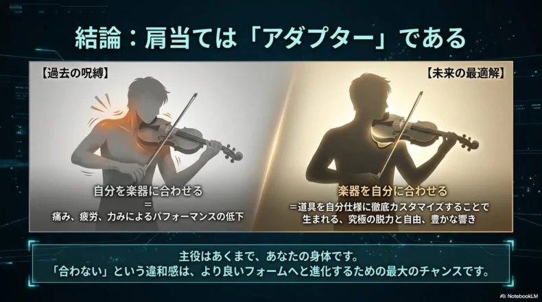 論理的に考えれば、肩当ては「体を楽器に合わせるための道具」ではなく、「楽器を体に合わせるためのアダプター」であるべきです。主役はあくまであなたの体。道具に体を合わせるのではなく、道具を徹底的に自分仕様にカスタマイズしていきましょう。