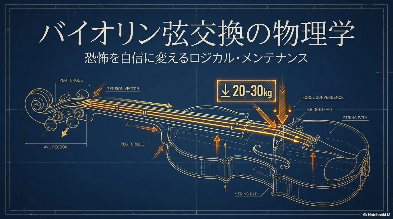 音高時代のバイオリン専攻の友人は、「バイオリンの弦交換は、まるで神経を尖らせた外科手術のようなもの」と例えていました。特に一番細いE線は、非常に鋭利で高い張力がかかっており、初心者が「切れて顔に飛んでくるのではないか」と恐怖を抱くのは無理もありません。