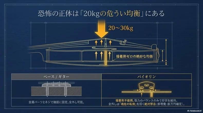 バイオリンのメンテナンスに対して「怖い」という感情を抱くのは、実は非常に健全な反応だと言えます。なぜなら、バイオリンは「構造の不安定さ」を前提に設計されている楽器だからです。