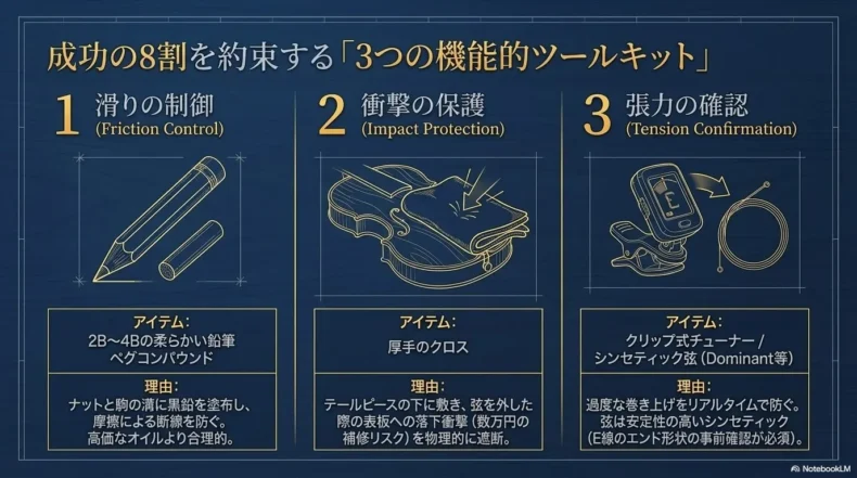 私がベースやギターのメンテナンスをする際は、ニッパーとクロス、それに指板オイルがあれば事足ります。しかし、バイオリンの弦交換を安全に、かつ「怖くない」状態で行うには、専用の道具と周到な準備が不可欠です。