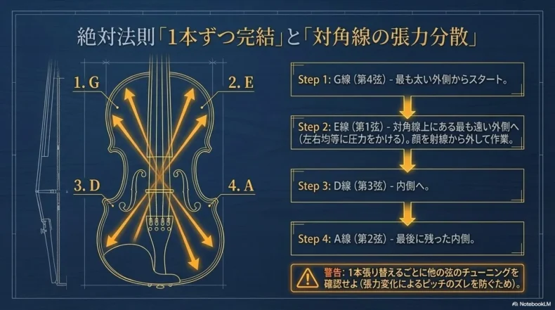 初心者が最も守るべき鉄則は、外側の弦から内側の弦へと攻めていく順番です。具体的には「G線(第4弦)→ E線(第1弦)→ D線(第3弦)→ A線(第2弦)」という流れが、最も駒への負担が少なく、安定して作業を進めることができると仲間の間では定石となっています。