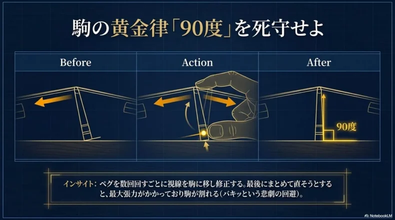 - 駒の管理:巻き上げ中に駒が指板側に傾くため、こまめに「垂直」へ押し戻すことが破損防止の鍵。