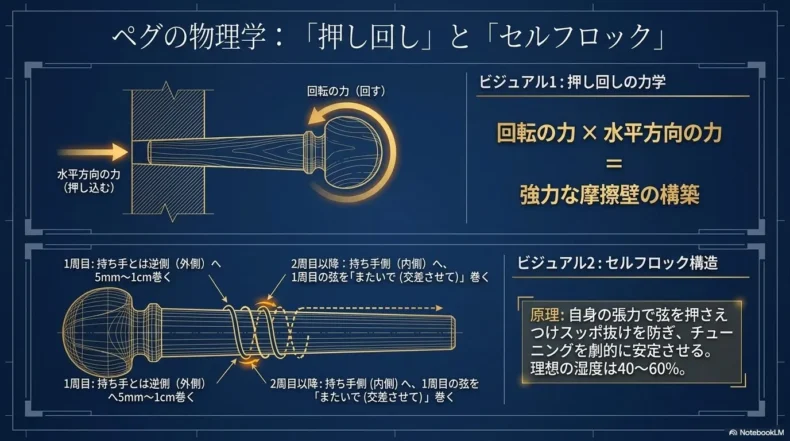 - ペグの調整:「押し回し」の技術と、ペグコンパウンドの活用で、滑りや固着を論理的に解決。