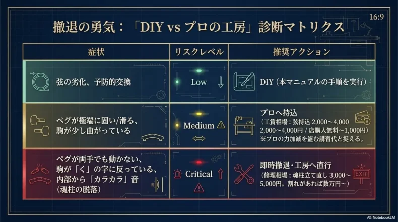 以下的な状態であれば、迷わず「店に頼む」という選択をしてください。これは独断ではなく、音楽高校時代のバイオリン教師が口酸っぱく言っていた警告に基づいています。