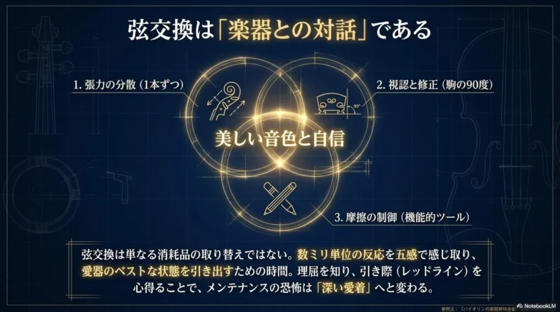 - 弦交換の鉄則:駒や魂柱の転倒を防ぐため、必ず「1本ずつ」交換し、全外しは厳禁。