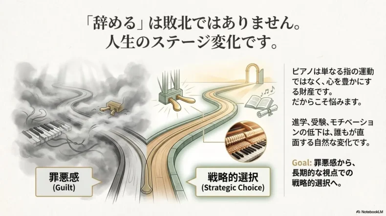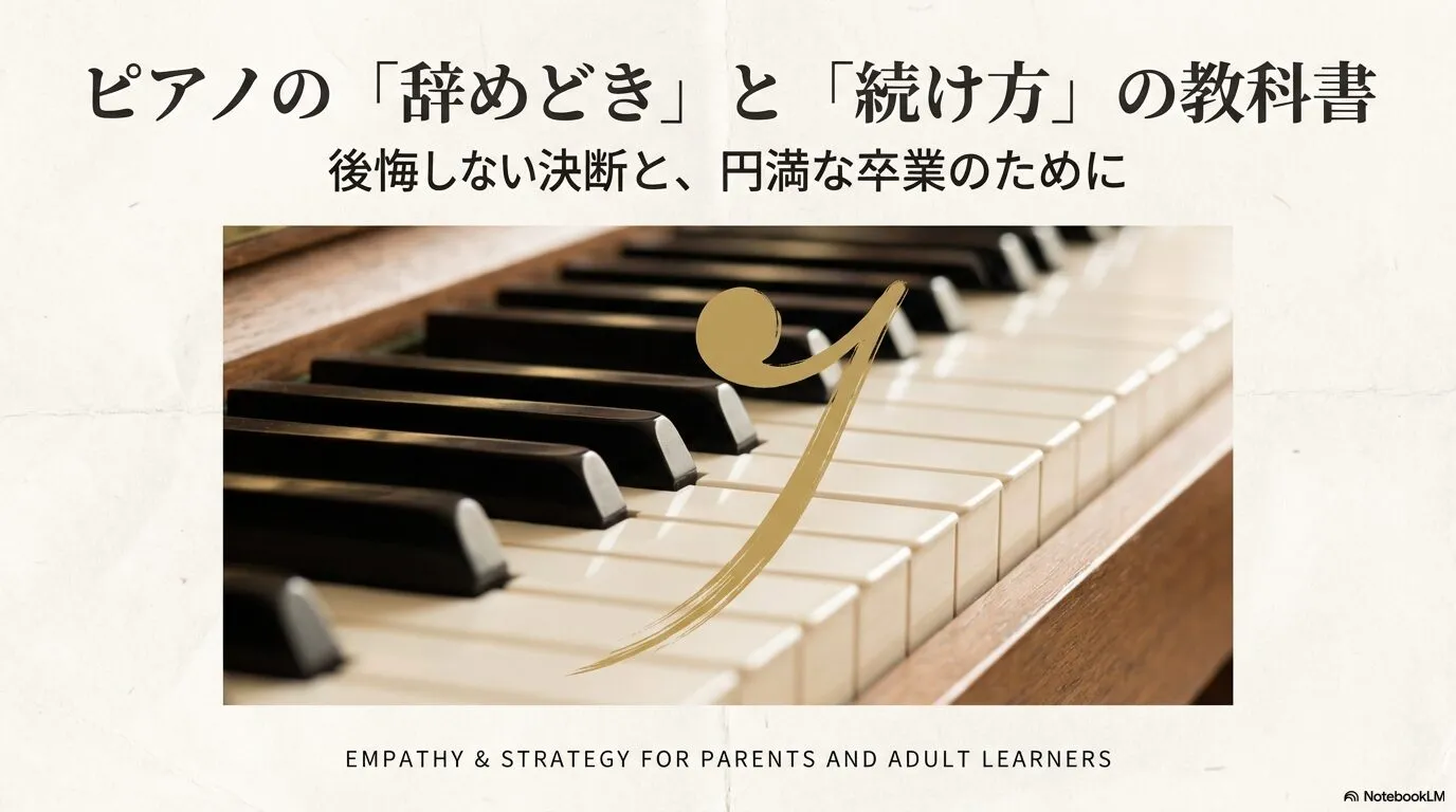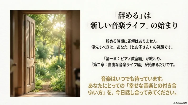 ピアノを辞める時期に正解はありません。早すぎることもなければ、遅すぎることもありません。大切なのは、親の意向や世間体、先生への義理ではなく、本人にとって音楽が「楽しいもの」「心地よいもの」であり続けられるかどうかという一点です。