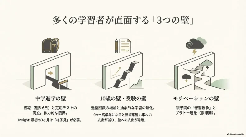 私立中学校や中高一貫校を目指す「中学受験」をする場合、ピアノとの両立はさらに過酷なものになります。一般的に、受験勉強が本格化するのは小学4年生頃からです。この時期は「10歳の壁」とも呼ばれ、学校の勉強内容も抽象度が高くなり難しくなる時期です。