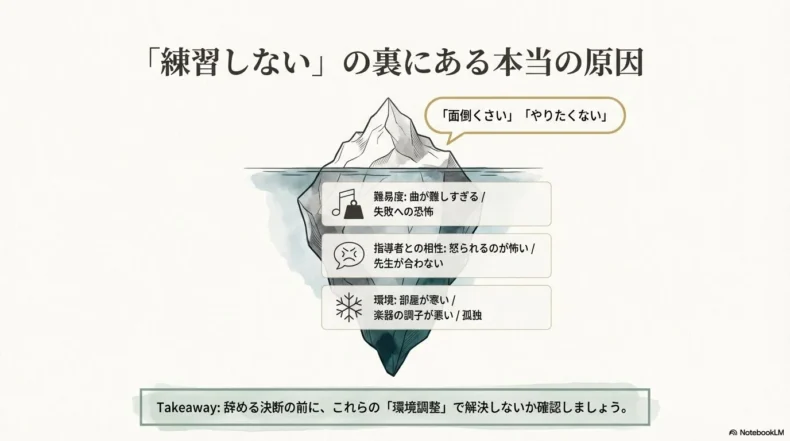 しかし、ここで一度立ち止まって考えてほしいのは、「なぜ練習しないのか?」という根本原因です。「単に面倒くさい」という理由ももちろんありますが、私の経験上、以下のような隠れた理由があることも多いのです。これを見抜かずに辞めさせてしまうと、子供の中に「自分はダメな子だ」という劣等感だけが残ってしまう可能性があります。