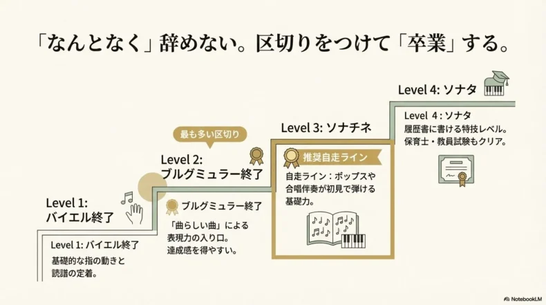 - ソナチネアルバムに入れるまで: ここまで行けば中級者の入り口です。ソナチネが弾ければ、世の中のポピュラーソングの楽譜や、合唱の伴奏譜などは初見でもそこそこ弾けるようになります。将来的に趣味として楽しむための「自走力」がつくラインです。