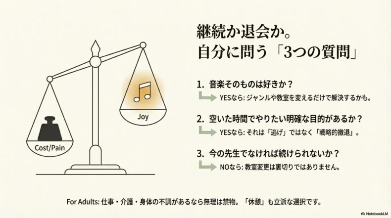 まず、判断に迷った時は、以下の3つの質問を自分(または子供)に問いかけてみてください。これらは、私がバンドメンバーの脱退や加入の相談に乗る時にも必ず確認する「核心を突くポイント」です。