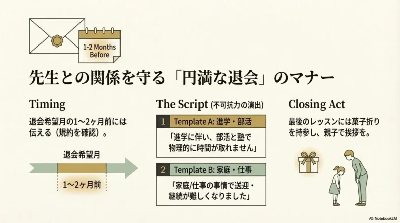 ポイントは「不可抗力で続けられない」というスタンスをとることです。「本人が辞めたがっている」と言うと、「一時的なものですよ」「曲を変えてみましょうか」と親切心から引き止められる隙を与えてしまいますが、物理的な時間や家庭の事情であれば、先生も「それなら仕方がないですね」と諦めざるを得ません。