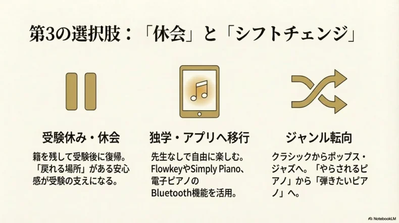 私の友人も、高校受験の半年間(中学3年の夏〜翌年3月)を休会し、合格後に復帰して発表会に出ていました。彼女曰く、「勉強がつらい時、ピアノという逃げ場が完全に閉ざされているのではなく、『受験が終わればあそこに戻れる』と思えたことが心の支えになった」そうです。「辞める」と「続ける」の間の「休む」というグレーゾーンを上手く活用することで、細く長く音楽と付き合うことができます。