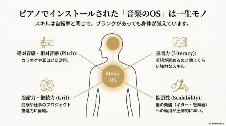 私が高校でベースを始めた時も、コード進行の理論やリズムの取り方で、幼少期のピアノ経験がどれほど役に立ったか計り知れません。もしピアノを辞めたとしても、これまでの練習時間は決して無駄にはなりません。「音楽の基礎体力」は十分に身についているので、将来どんな形であれ、音楽を楽しむ土台としてあなたを支えてくれるはずです。ピアノ教室での経験は、あなたの「OS(オペレーティングシステム)」としてインストールされており、今後どんな「アプリ(新しい楽器や音楽活動)」を入れても、スムーズに動かしてくれるのです。